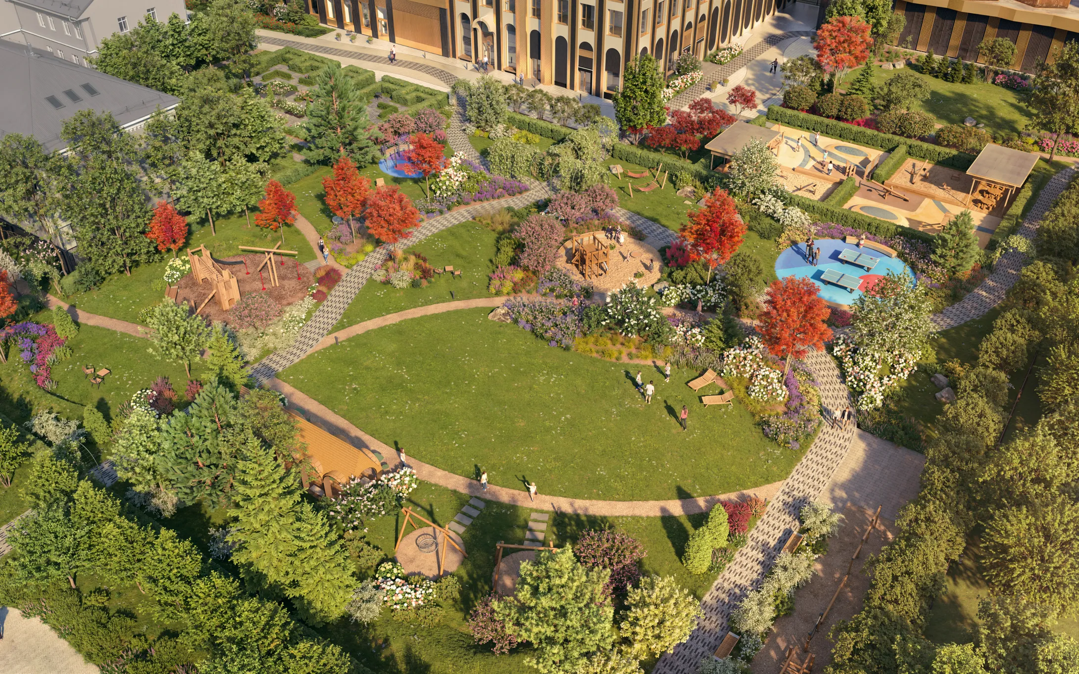ERA draws on English park art to recapture the carefree nature of urban nature. From whatever angle you look at the ERA courtyard, it will remind you of a postcard taken by a talented nature photographer.