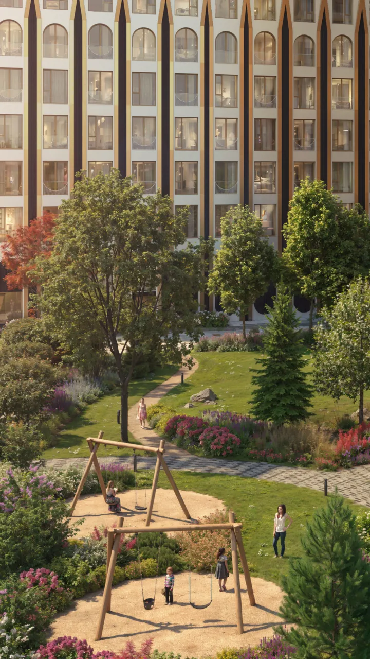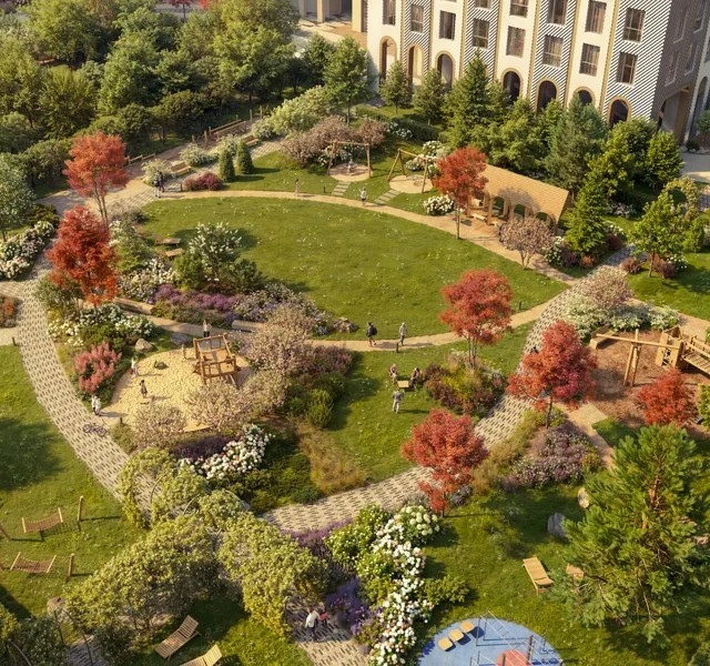 ERA draws on English park art to recapture the carefree nature of urban nature. From whatever angle you look at the ERA courtyard, it will remind you of a postcard taken by a talented nature photographer.
